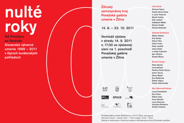 Považská galéria umenia v Žiline v zriaďovateľskej pôsobnosti Žilinského samosprávneho kraja Vás pozýva na vernisáž výstavy Nulté roky (Slovenské výtvarné umenie 1991-2011 v štyroch kurátorských pohľadoch). Uskutoční sa v stredu 14. septembra 2011 o 17.00 hod vo výstavných priestoroch na 1. poschodí PGU v Žiline. V pilotnom projekte galérie tohto roka sú prezentované diela autorov a autoriek, ktorí svojou tvorbou formovali podobu slovenského výtvarného umenia v tzv. „nultých“ rokoch. Iniciovali ho kunsthistorici Juraj Čarný, Gabriela Garlatyová, Richard Gregor a Mira Sikorová-Putišová. ktorí majú na kritickom zhodnocovaní umenia nultých rokov svoj výrazný podiel, a zároveň sú kurátormi výstavy.